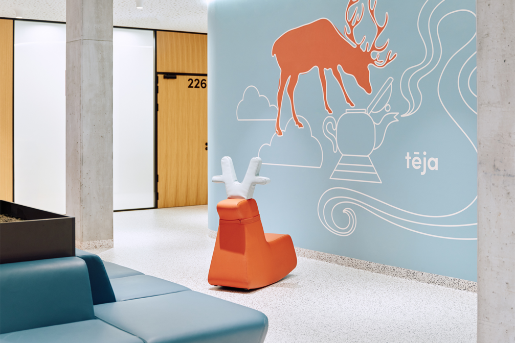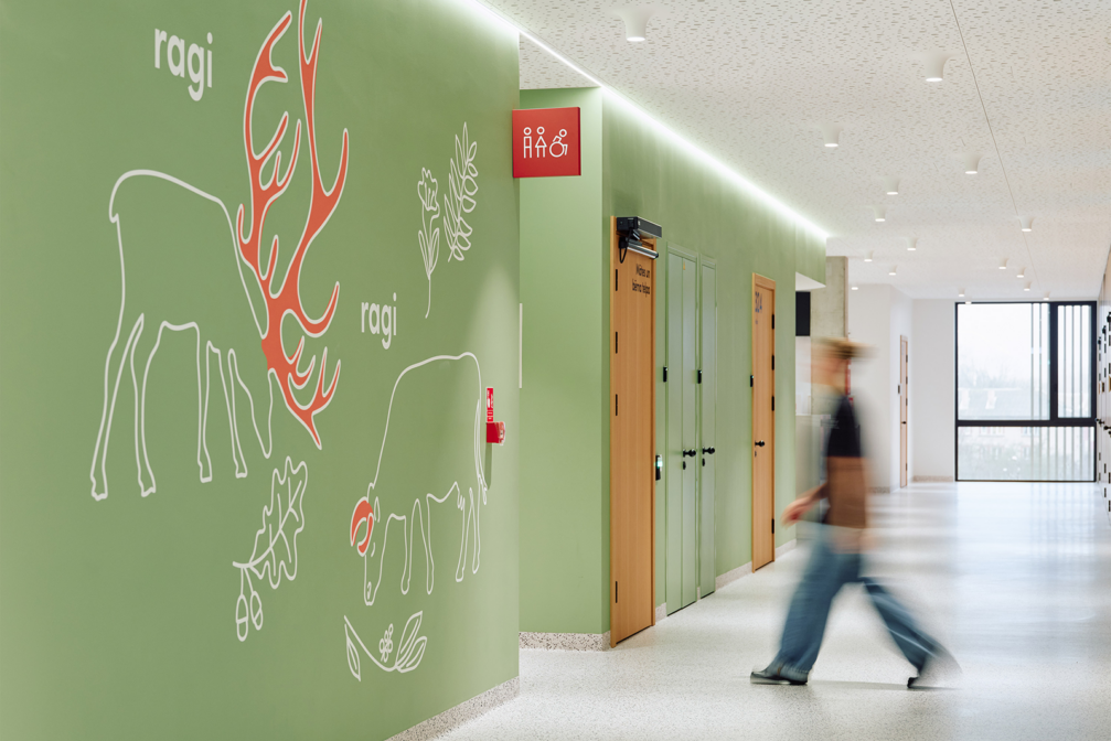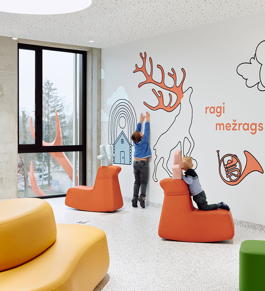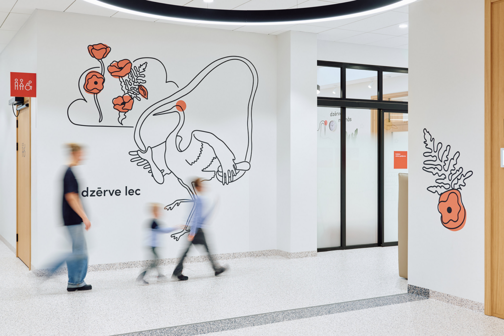 Slimnīcas ēka, kas, pateicoties lielizmēra dzīvnieku figūrām pie ieejām, dēvēta arī par Brieža un Dzērves māju, slimnīcas teritorijā palīdz strukturēt sarežģītu vidi, padarot orientēšanos intuitīvu un draudzīgu. Telpu grafikas dizains un navigācija, ko biroja «Mark Arhitekti» arhitektūras ietvarā veidojis dizaina birojs «H2E», ir īstenoti, apvienojot estētiku un funkcionalitāti, lai radītu mierīgu un iedvesmojošu vidi bērniem, viņu vecākiem un personālam. Galvenie tēli — sarkanais briedis un zilā dzērve —, interpretēti vizuālos stāstos, sniedz bērniem atbalstu, iedvesmu un atstāj vietu iztēlei. Interaktīvās projekcijas, spēles un telpu grafika veido ārstniecības procesu emocionāli atbalstošāku, uzlabo bērnu labsajūtu un atveseļošanās pieredzi. Dizains tapis ciešā sadarbībā ar mediķiem. Šīm telpām radīts arī īpašs sēdelementu dizains.