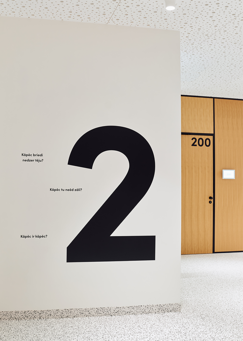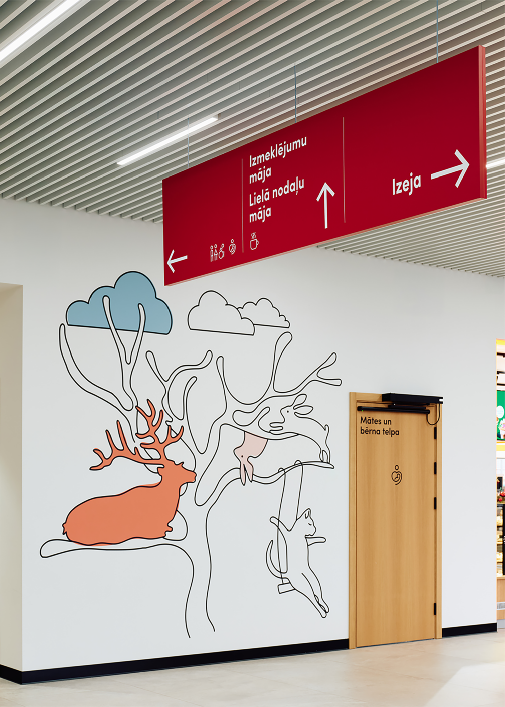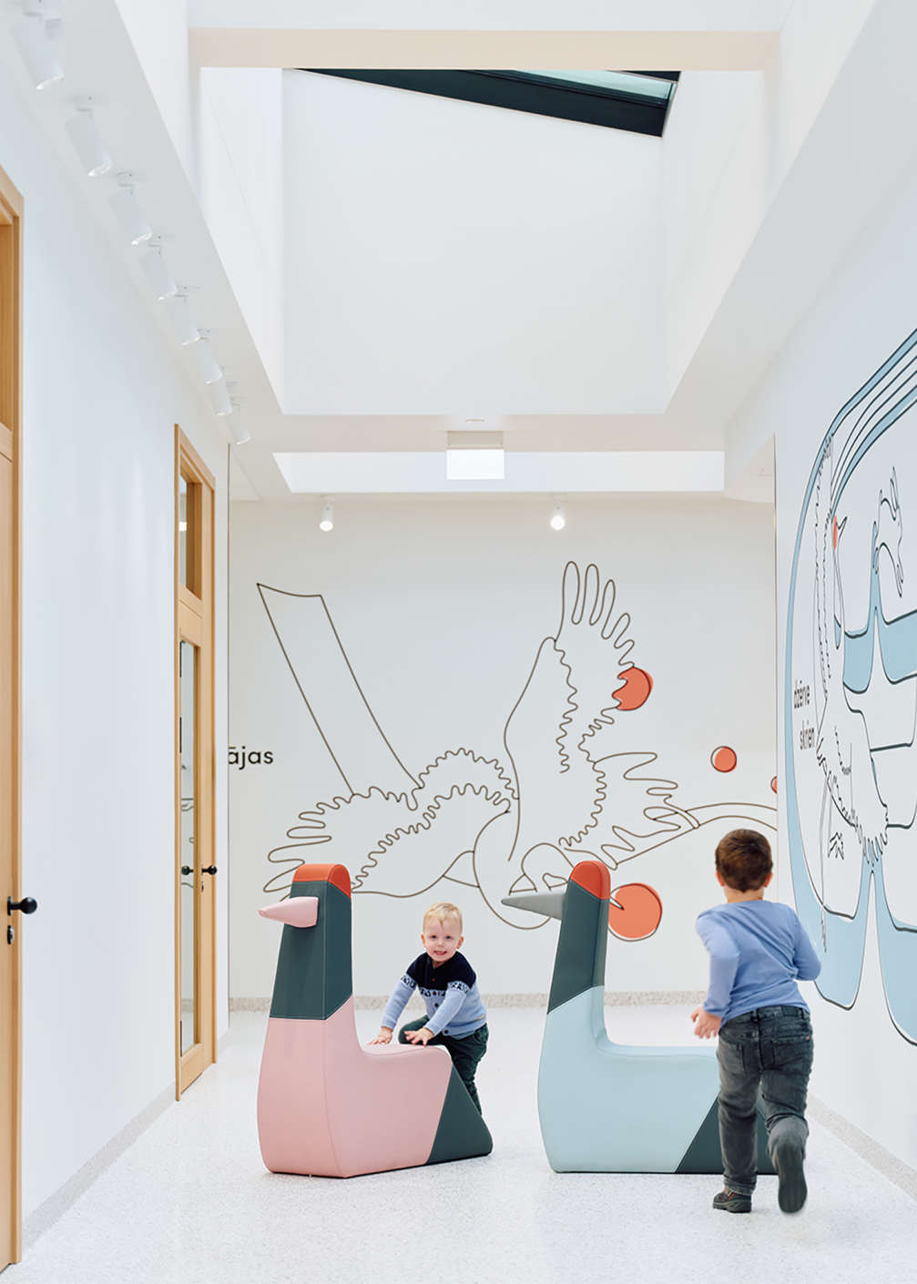 Slimnīcas ēka, kas, pateicoties lielizmēra dzīvnieku figūrām pie ieejām, dēvēta arī par Brieža un Dzērves māju, slimnīcas teritorijā palīdz strukturēt sarežģītu vidi, padarot orientēšanos intuitīvu un draudzīgu. Telpu grafikas dizains un navigācija, ko biroja «Mark Arhitekti» arhitektūras ietvarā veidojis dizaina birojs «H2E», ir īstenoti, apvienojot estētiku un funkcionalitāti, lai radītu mierīgu un iedvesmojošu vidi bērniem, viņu vecākiem un personālam. Galvenie tēli — sarkanais briedis un zilā dzērve —, interpretēti vizuālos stāstos, sniedz bērniem atbalstu, iedvesmu un atstāj vietu iztēlei. Interaktīvās projekcijas, spēles un telpu grafika veido ārstniecības procesu emocionāli atbalstošāku, uzlabo bērnu labsajūtu un atveseļošanās pieredzi. Dizains tapis ciešā sadarbībā ar mediķiem. Šīm telpām radīts arī īpašs sēdelementu dizains.