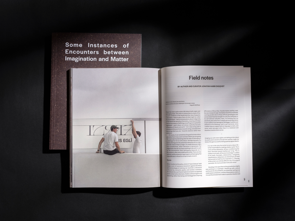 Andris Eglītis stāsta, ka doma izdot «Izstāde. Daži iztēles un matērijas satikšanās gadījumi» katalogu nāca neilgi pirms tās atklāšanas. Sākumā mērķis bija pabeigt katalogu tā, lai tas būtu pieejams izstādes pēdējā dienā, taču tas izrādījies neiespējami. Līdz ar to aktualizējās jautājums par grāmatu kā atsevišķu, «pašvērtīgu» lietu, kas auditoriju sasniedz arī ārpus izstādes konteksta. Līdzīgi kā Andra pirmā grāmata — «Gaišs, apcirsts paralelograms» — arī jaunais izdevums ļauj iepazīt mākslinieka praksi. «Atšķirībā no izstādes, grāmatas formāts ļauj parādīt procesu un dot plašāku priekšstatu par to. Vismaz līdz šim man nav izdevies atrast labu veidu, kā izstādē iekļaut procesa dokumentāciju,» skaidro Andris.