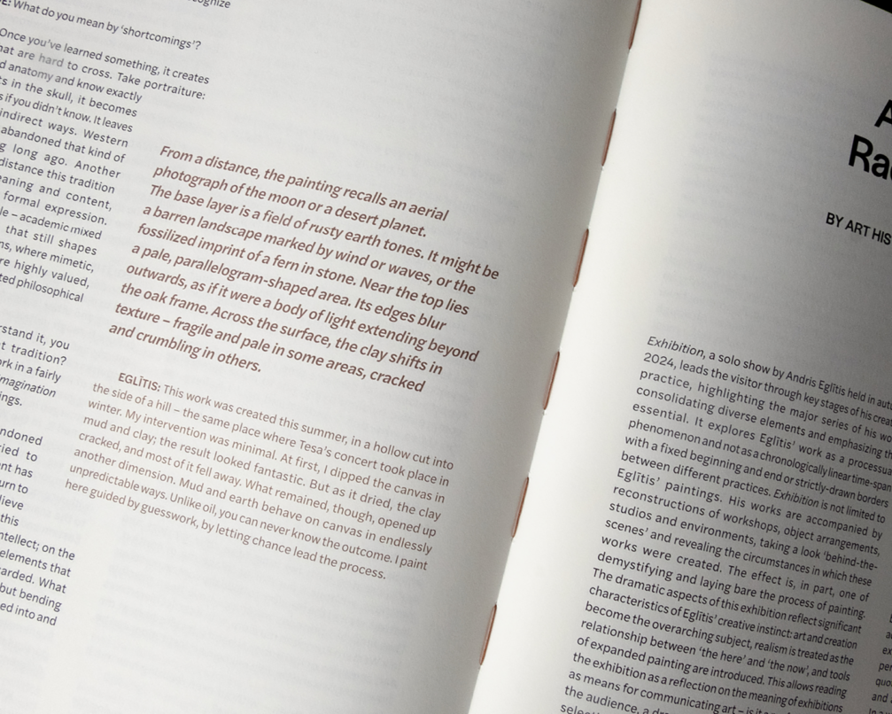 Pagājušā gada izskaņā zviedru mākslas izdevniecības «Arvinius + Orfeus Publishing» laida klajā grāmatu «Daži iztēles un matērijas satikšanās gadījumi», kas veltīta mākslinieka Andra Eglīša darbam, fokusējoties uz 2024. gada izstādi Latvijas Nacionālajā mākslas muzejā. Sākotnēji iecerēts kā izstādes katalogs, izdevums veidots kā patstāvīgs radošais darbs, kas tapis ciešā sadarbībā starp mākslinieku, fotogrāfu Reini Hofmani, dizaineri Unu Grants un tekstu autoriem.