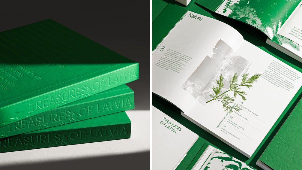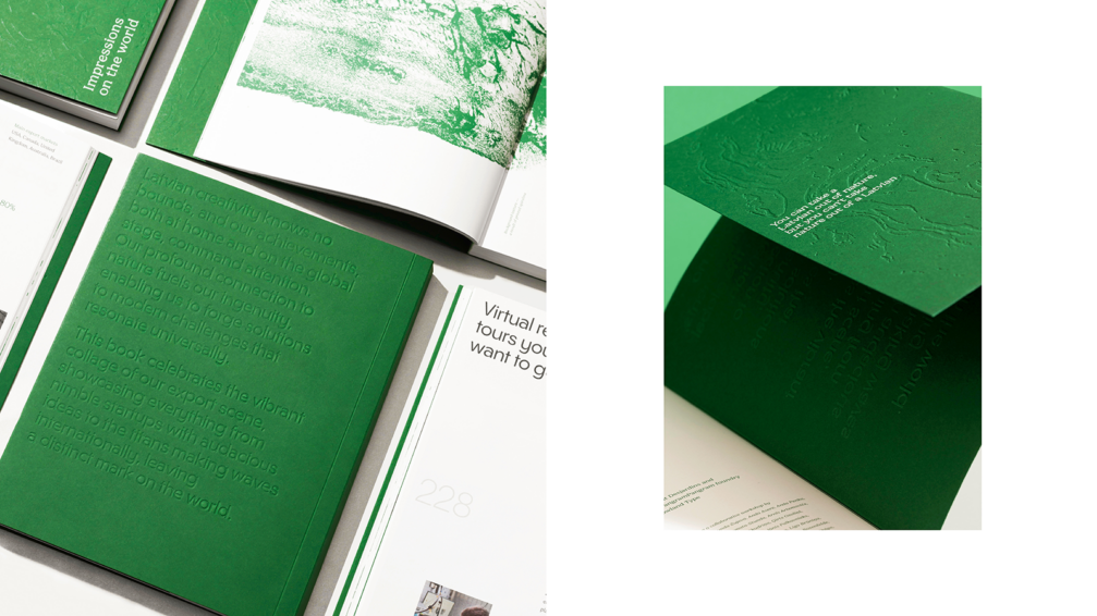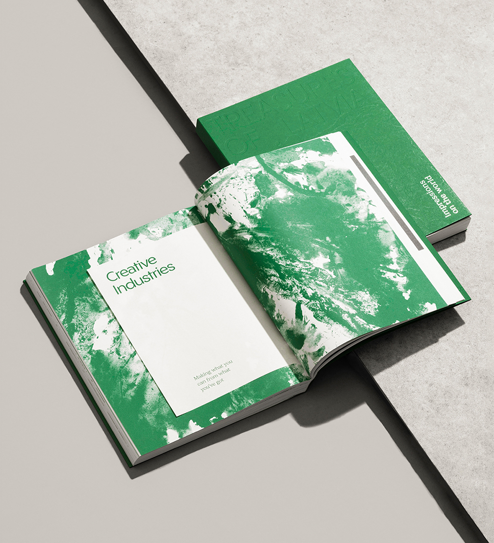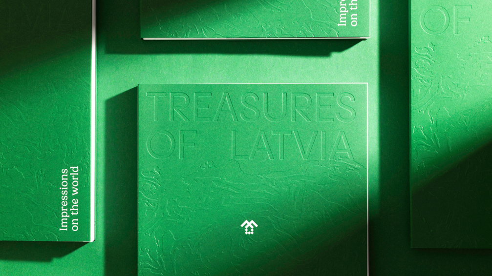 Grāmata «Treasures of Latvia» atklāj daudzveidīgu Latvijas eksportētāju pasauli — no drosmīgiem jaunuzņēmumiem līdz atzītiem līderiem, kas nes Latvijas vārdu ārpus robežām un atstāj pozitīvus nospiedumus globālajā tirgū. Arī izdevuma koncepcijas pamatā ir nospiedumi — dabas pēdas, kas grāmatas vizuālajā veidolā atklājas gan burtiski, gan kalpo kā iedvesmas avots. Izdevuma grafiskais tēls pauž dabas kā latviskuma esences ideju ikkatrā niansē. Nospiedumu veidošanā dizaina autori iesaistīja uzņēmējus, kuru stāsti iekļauti grāmatā, radošas koprades laikā tos veidojot, pēcāk digitalizējot un iekļaujot izdevuma lapaspusēs. Tā kā izdevums galvenokārt kalpo kā reprezentatīvs materiāls starptautiskiem partneriem, dizaineri nolēma asprātīgi iedzīvināt kādu labi zināmu faktu — latvieši pievieno dilles visam. Vienā no grāmatas atvērumiem ievietots īsts dilles zariņš, kas līdzīgi kā sen aizmirsts herbārija paraugs pārsteidz lasītāju ar savu klātbūtni un aromātu. Tādējādi šī kļūst par pirmo «grāmatu ar dillēm», ne tikai pārstāvot Latvijas spēku pasaulē, bet arī veidojot unikālu lasīšanas un vizuālo pieredzi. Vairāk par izdevuma dizainu — šeit.