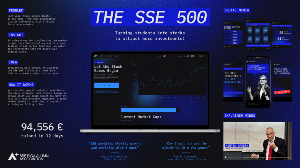 Rīgas Ekonomikas augstskolas (SSE Rīga) stipendiju fonds ir atkarīgs no absolventu ziedojumiem, kuru apjomam ar katru gadu bija tendence sarukt. Lai no jauna piesaistītu absolventu uzmanību un atbalstu nākamajiem studentiem, bija nepieciešama jauna pieeja. Kampaņa «SSE500» runā valodā, ko universitātes absolventi zina vislabāk — finanšu valodā. Iedvesmojoties no Volstrītas, «SSE500» pārvērta studentus par aktīviem labdarības akciju indeksā. Īpaši šim nolūkam izstrādāta platforma, kas ietvēra spēļošanas elementus, reitingu tabulas un dinamisku «cenu» maiņu, simulēja īstu biržu, pārvēršot ziedošanu aizraujošā, konkurenci veicinošā finanšu pieredzē.