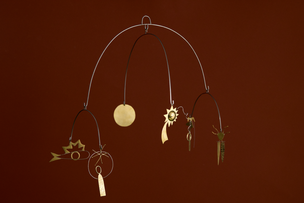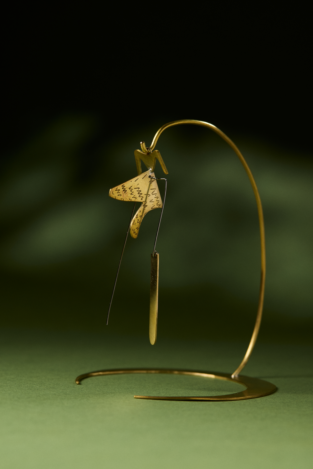 The Parade of Winter Guardians consists of six interior objects — miniature sculptures — and a kinetic mobile that symbolically reflects the myths of the creation of the world. The images in the collection are inspired by Latvian masking traditions and processes in nature, depicting various figures and symbols significant in Latvian folklore — the Wolf and the Goat, the Moonbeam, the Circle of Time, the Golden Trout, and the Giant carrying the Sun on his shoulders.