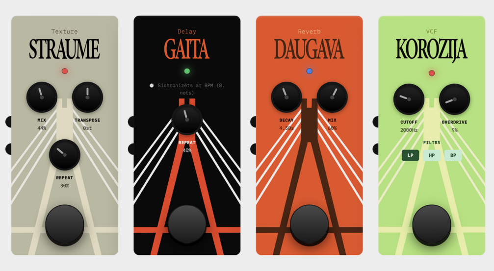 To draw attention to the city’s relationship with the Vanšu Bridge and its sad state, Jānis has created an online app titled Vantofons, which allows users to synthesise sounds, bringing architectural heritage to life in a new context. It is a non-commercial project that was created as the author was experimenting with technology, sound, and design in his home recording studio. On the website Vantofons.lv users can click on the strings of the Vanšu Bridge, compose soundscape sequences, remix music, and record their work. A series of sound effect pedals named Straume (Flow), Gaita (Pace), Daugava and Korozija (Corrosion) is also available.