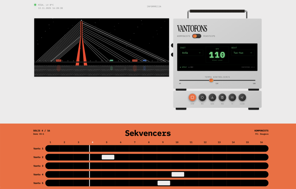 Vantofons’ sound design is characterised by lo-fi or unpolished sounds, ambient music and post-electronic aesthetics, offering a journey of sound that is reminiscent of traffic noise, the wind blowing over the Daugava River, and the silence at night. You can hear them not only by creating your own sounds but also by listening to the album Vanta Fei — Transports. The hour-long recording combines songs with titles that tell a story about life in the city.