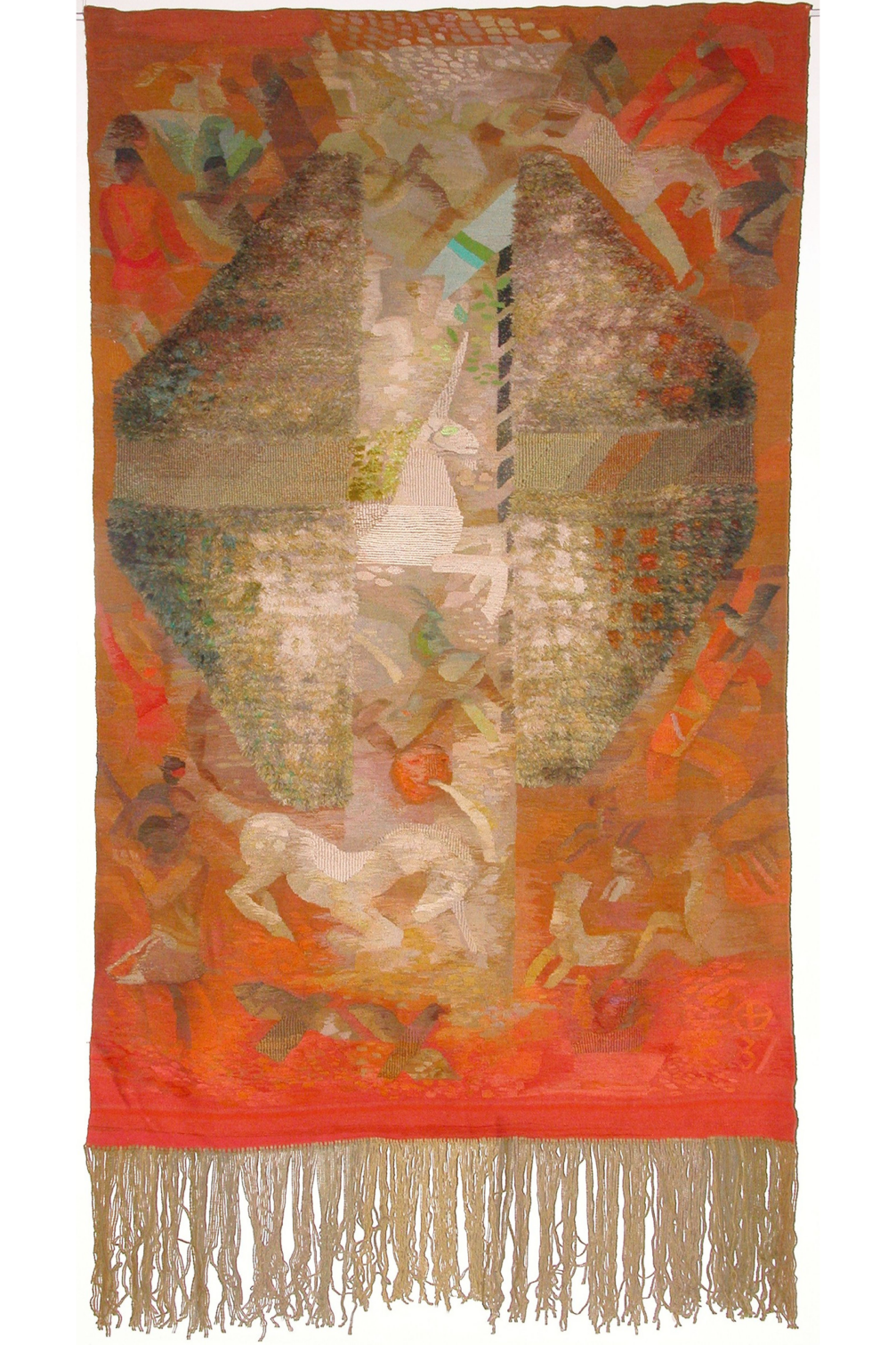 Barkāns’ textile works are defined by strong compositional structures influenced by Proto-Renaissance and Cubism, as well as a rich, finely nuanced colour palette. His themes draw on Latvian ethnography, Riga’s architectural heritage, and broader world cultures, frequently entering the realm of mythology. The unicorn became a recurring and particularly significant motif, inspired by medieval European tapestry traditions Barkāns encountered at the Musée de Cluny in Paris.